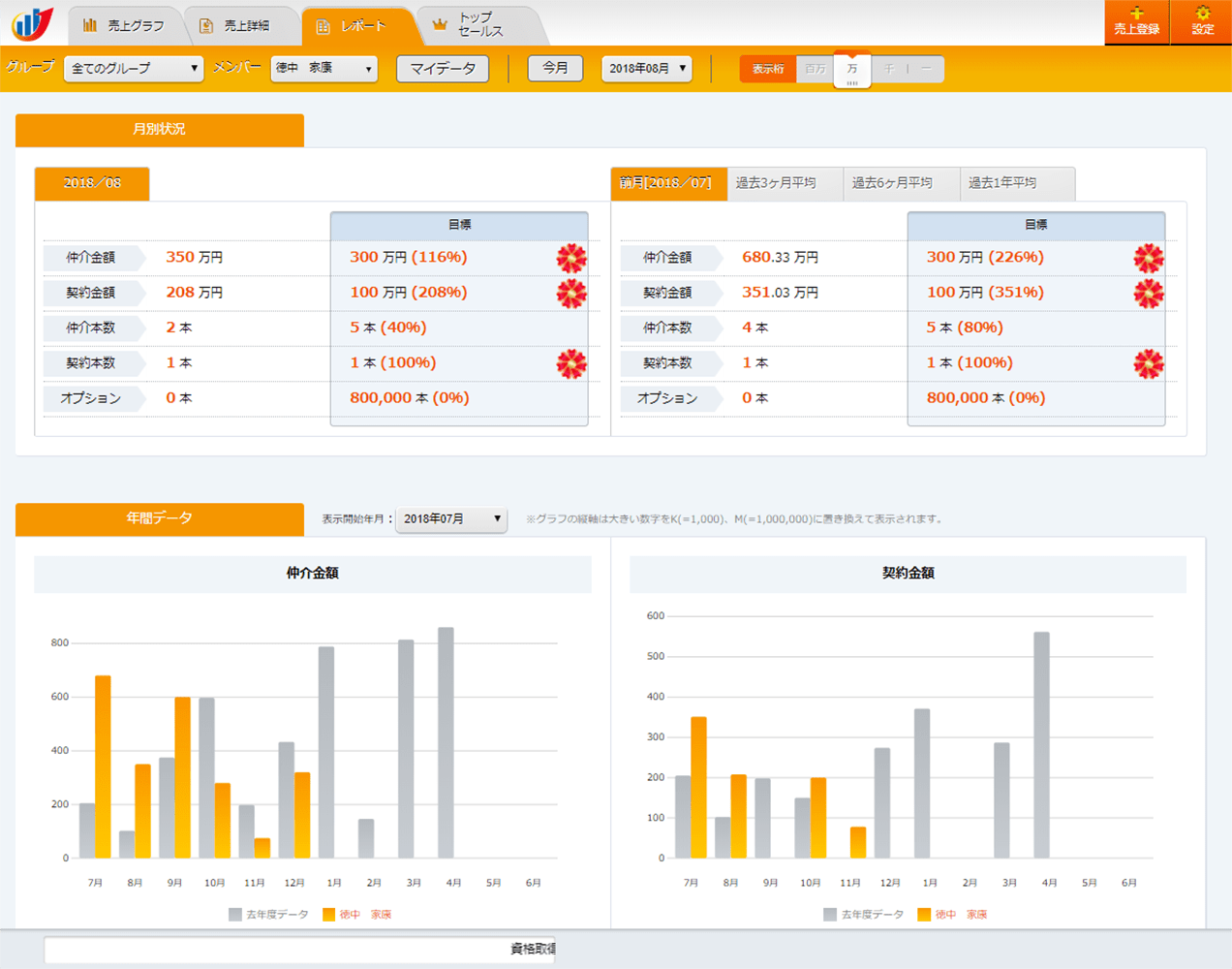 売上登録した実績は、営業や店舗毎にレポート形式で自動的に集計されます。自己分析の資料、成績表、全体ミーティングの資料などにご活用いただけます。